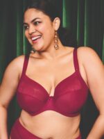 Upp till kupa M – stadig bh med stretch i spetsdelen. Nedre delen av kupan är helt stum och bär upp brösten effektivt. Kupan är v-ringad (låg centrefront) och stretchspetsen, som är helt slät, ligger snyggt an mot bysten och ger en mjuk övergång mot huden.
